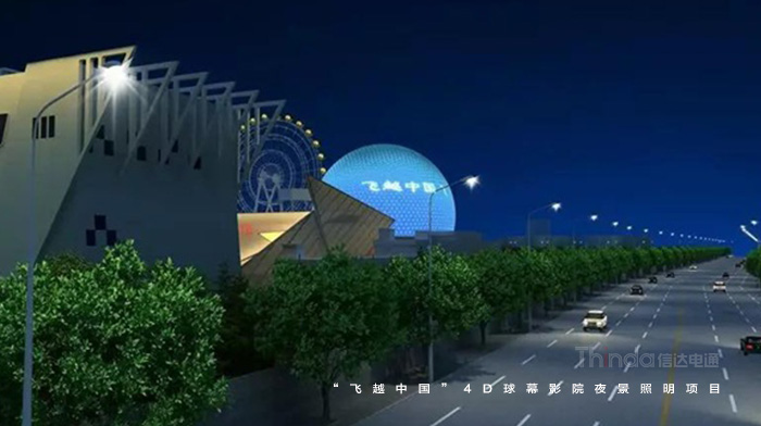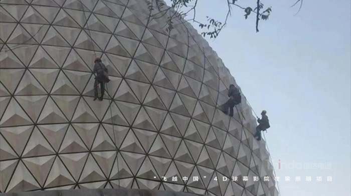 隨著球幕外立面光色切換,“我愛你中國”、“飛覽天下飛越中國”等主題字幕滾動播出。為實現預期的設計效果,信達團隊多次夜間試燈。