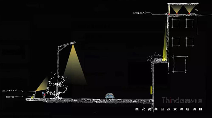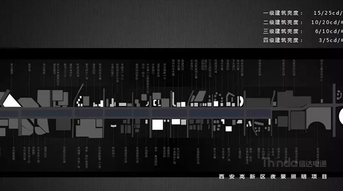 在高新區的亮化設計中,信達電通以安全、舒適、美觀的照明效果為目標;以綠色照明設計理念為先導;以先進的照明技術做支撐;以高效性、智能化城市照明管理體系為保障。遵從人性化、可持續化、高效智能化的照明原則,打造凸顯城市個性突出地域特色的城市夜景。照明總目標是:以道路主軸照明體系形成聚合延伸的產業核心區。
