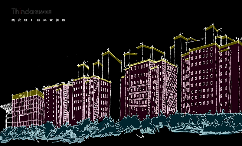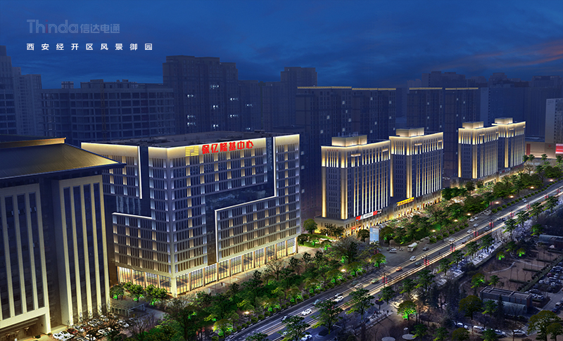 風景御園位于西安市經開區鳳城八路,在市政府對面,本項為商業辦公樓夜景照明設計,建筑的立面材質為淺色石材為主。四棟建筑的建筑形態相同,沿縱向結構游走,整體造型簡潔、大氣,本項屬于高層建筑。