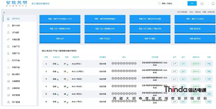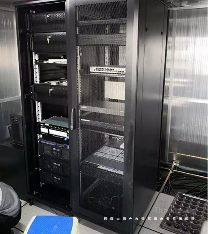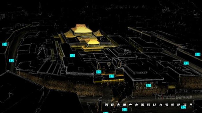 大昭寺的整體照明控制采用信達科技自主研發的鼎立慧聯智能控制系統。控制系統采用手動、時間經緯度、4G智能照明等控制方式,控制模式分為節能、平日、節日三種模式,總控制室設定在管委會樓頂景觀照明控制室。大昭寺四周所有投光燈具使用DALI調光控制系統,主控設備具有RS485擴展接口,同時系統可通過電腦圖形化界面對所有的燈光進行集中控制監視。