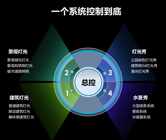 本項目采用“鼎立慧聯”智慧照明云服務平臺,通過云控制器的核心管理,景觀燈光、燈光秀、建筑燈光、水景秀實現了單一系統遠程控制、場景控制和數據監控。