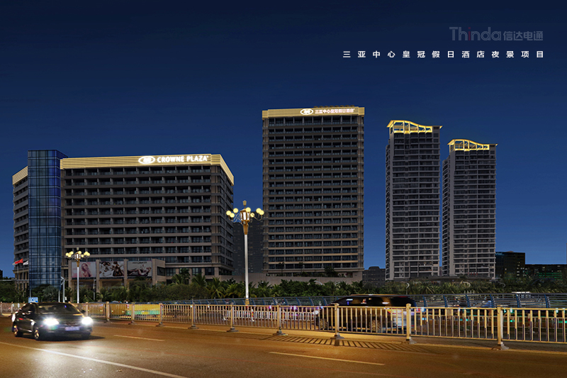 三亞中心皇冠假日酒店地處三亞市中心榆亞路,毗鄰景色秀麗的臨春河,與大東海沙灘及碧藍遼闊的中國南海近在咫尺;距離三亞鳳凰國際機場17公里,三亞火車站11公里,與鴻洲國際游艇會僅幾分鐘。周邊環繞活力四射的酒吧一條街,充滿時尚氣息的三亞國際購物中心,以及鹿回頭公園,三亞第一市場等眾多著名旅游景點。信達電通是三亞中心皇冠假日酒店外立面夜景照明的燈光設計商,此項目是三亞主城區夜景照明計劃規劃中的酒店亮化建筑,信達設計師團隊對此酒店外立面照明進行設計。