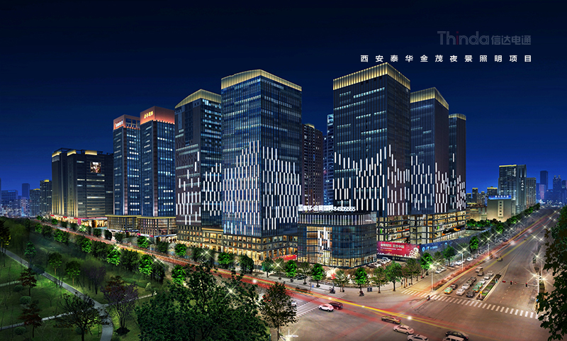 泰華·金貿國際位于西安高新區金融圈與商務圈的交匯地帶,與唐城墻遺址公園僅一路之隔。有西安首創山水云陶筑玻璃幕墻,高端商務會所,啟封現代商務的新風范。信達根據辦公樓的戶外亮化照明設計要素和泰華·金貿國際建筑景觀特點以及所處的地理位置,對泰華·金貿國際進行戶外亮化照明設計改造工作。改變了泰華·金貿國際之前的色系昏暗現狀,增加了建筑的外立面整體效果及廣告照明的效果,洗亮泰華·金貿國際建筑頂部,凸顯天際效果,使泰華·金貿國際成為西安夜色下一道亮麗的風景。